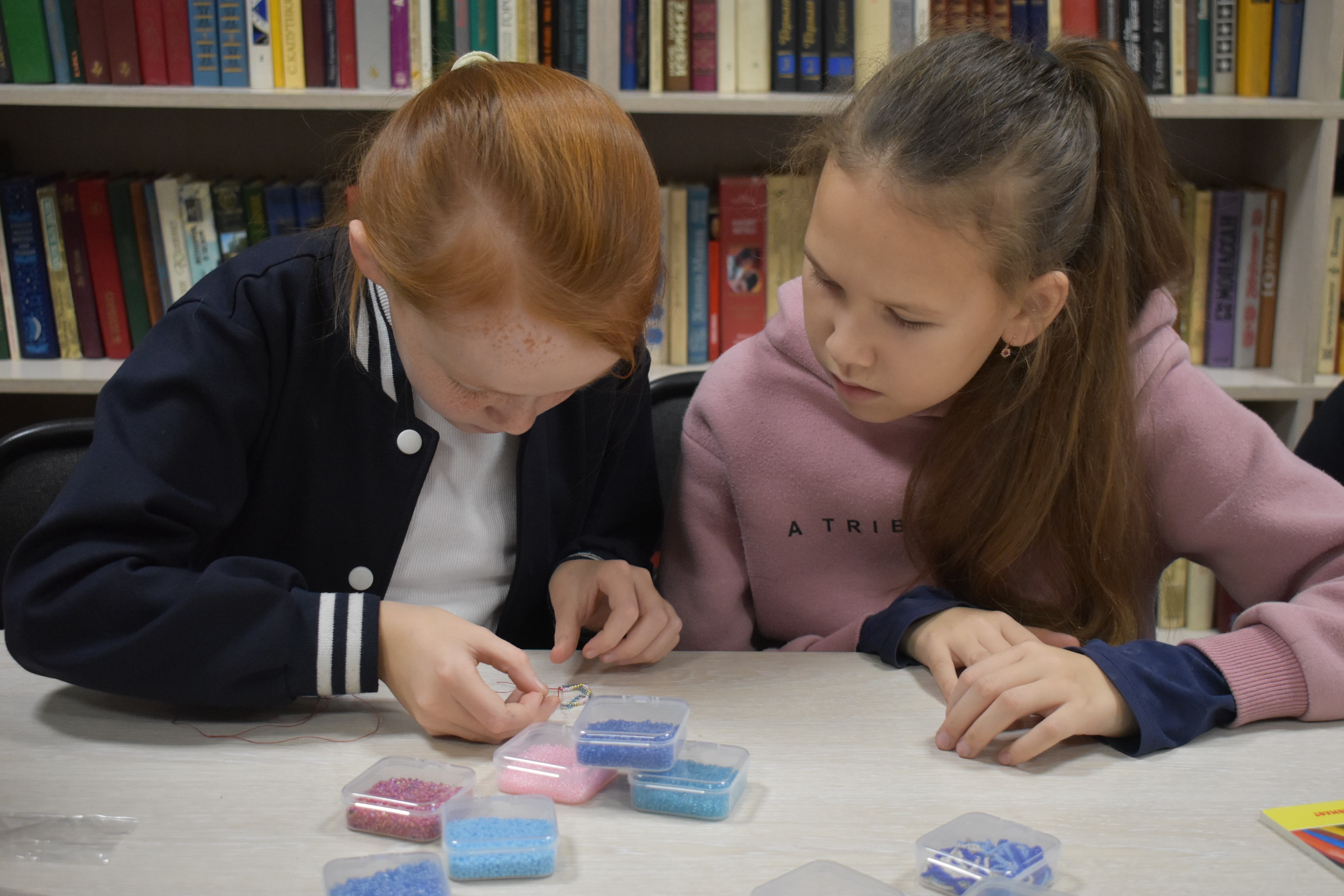На рабочем месте были уже приготовлены разноцветный бисер, иглы, нитки, ножницы. Библиотекарь Маргарита Лаптева показала основные техники и приёмы, помогающие создавать украшения. Для начала решили сделать простейшее изделие – двухцветное колечко. Для чего нанизывали бисер одного цвета на нить, затем добавляли бисер другого цвета и переплетали друг с другом. Все с большим увлечением принялись за дело, выбирали самые яркие цвета, примеряли будущее колечко, убавляли или добавляли бусины. Во время работы узнали о том, какие цвета и узоры используется в чувашской культуре, что они означают. Юные мастерицы были довольны своими новыми украшениями, теперь они смогут не только носить оригинальные украшения, но и подарить их близким.